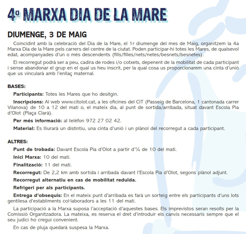 Aquest any tornem a organitzar una Marxa del Dia de la Mare pels carrers del centre de la ciutat. Poden participar-hi totes les Mares, de qualsevol edat, acompanyades d’un o més descendents (fills/filles/nets/netes/besnets/besnetes).